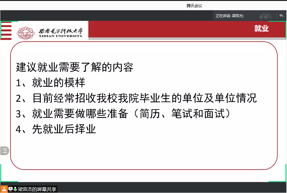 辅导员梁双杰老师结合近两年的就业形势,提醒同学们不要错过“金九银十”的就业机会,结合自身特点,制作修改简历,认真准备笔面试,有计划地推进个人秋招进度。梁老师强调,同学们要“先就业、再择业”,开阔眼界,多尝试、多了解,不要在一开始就限定了自己的可能性。