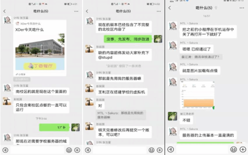针对小程序运行之初,访问带宽受限、并行处理能力弱、小程序发布审核时间久等问题,足球赌注网站崔江涛教授、彭延国副教授带领研究生一起帮助张玉鉴加班加点提供解决方案,设计了支持高并发的部署方案,统筹协调计算中心开辟了专用虚拟服务器资源,争分夺秒完成了应用迁移,同时联系腾讯公司加速小程序审核,确保了“XDer今天吃什么”小程序及时发布。目前云选餐服务可以正常使用,后续将根据同学们的建议进一步完善相关功能。