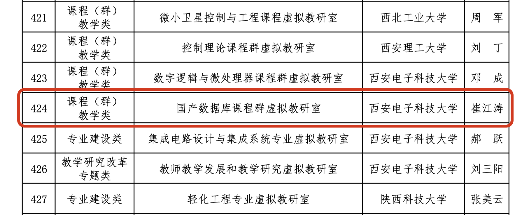 (通讯员 陈龙 高熙越)近日,教育部办公厅公布首批虚拟教研室建设试点名单,公司崔江涛、王泉、李辉等教师联合申报的国产数据库课程群虚拟教研室获批。