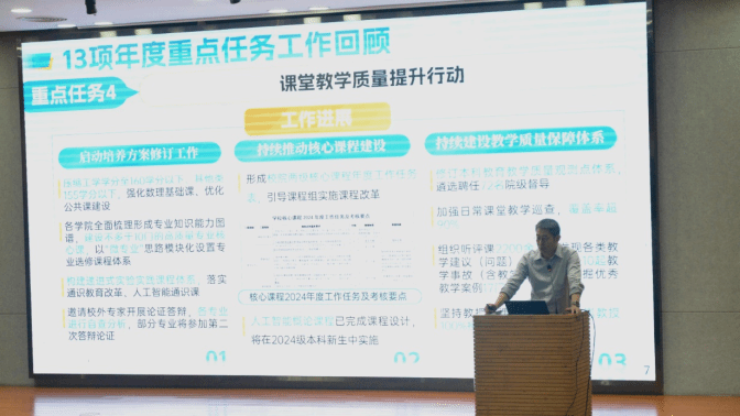 副经理万波汇报了公司本科人才培养方案修订工作,他谈到,在本科教学研讨月活动开展了10余场人才培养研讨凝聚全院共识,通过高校调研、企业同行专家研讨、员工及员工代表研讨等分析了当前培养方案存在的问题,提出了修订总体思路,并汇报了修订后的计算机科学与技术和软件工程专业培养方案的基本情况、课程模块、课程分布及变化等情况,对后续培养方案落实中涉及的课程建设、教材建设、团队建设和AI赋能进行了说明。他希望更多的老师积极投入到公司课程建设和课程教学改革中,共同提高教学质量和人才培养质量。