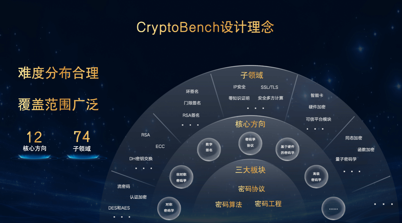 为健全密码学领域大模型测评体系,团队同步发布自主研发的密码学行业测评基准 CryptoBench,实现了对密码算法、密码协议及密码工程实践的全维度、系统化评估。该测评体系涵盖密码学 12个核心方向、细分至74个专业领域,全面覆盖密码学知识体系,为大模型能力提供科学的评估标准。