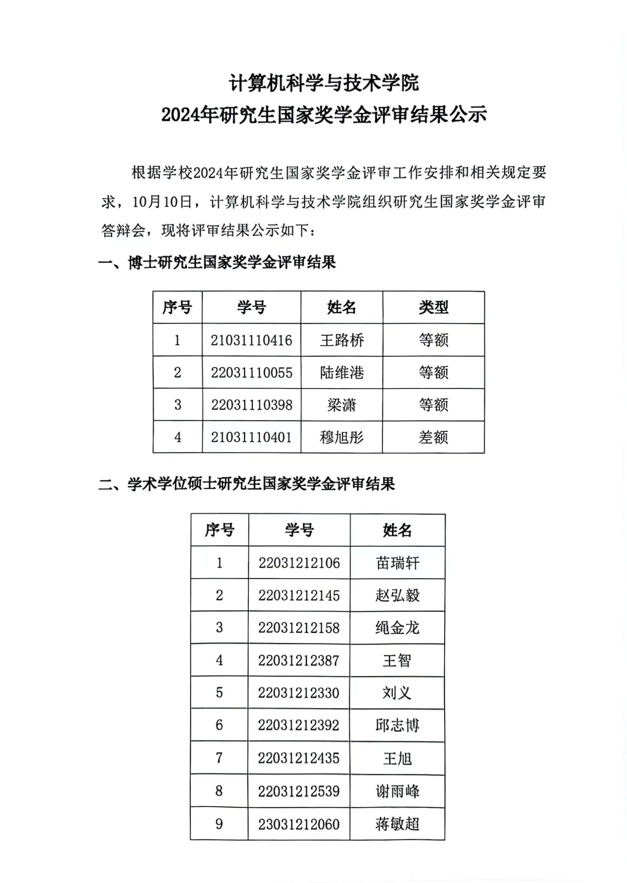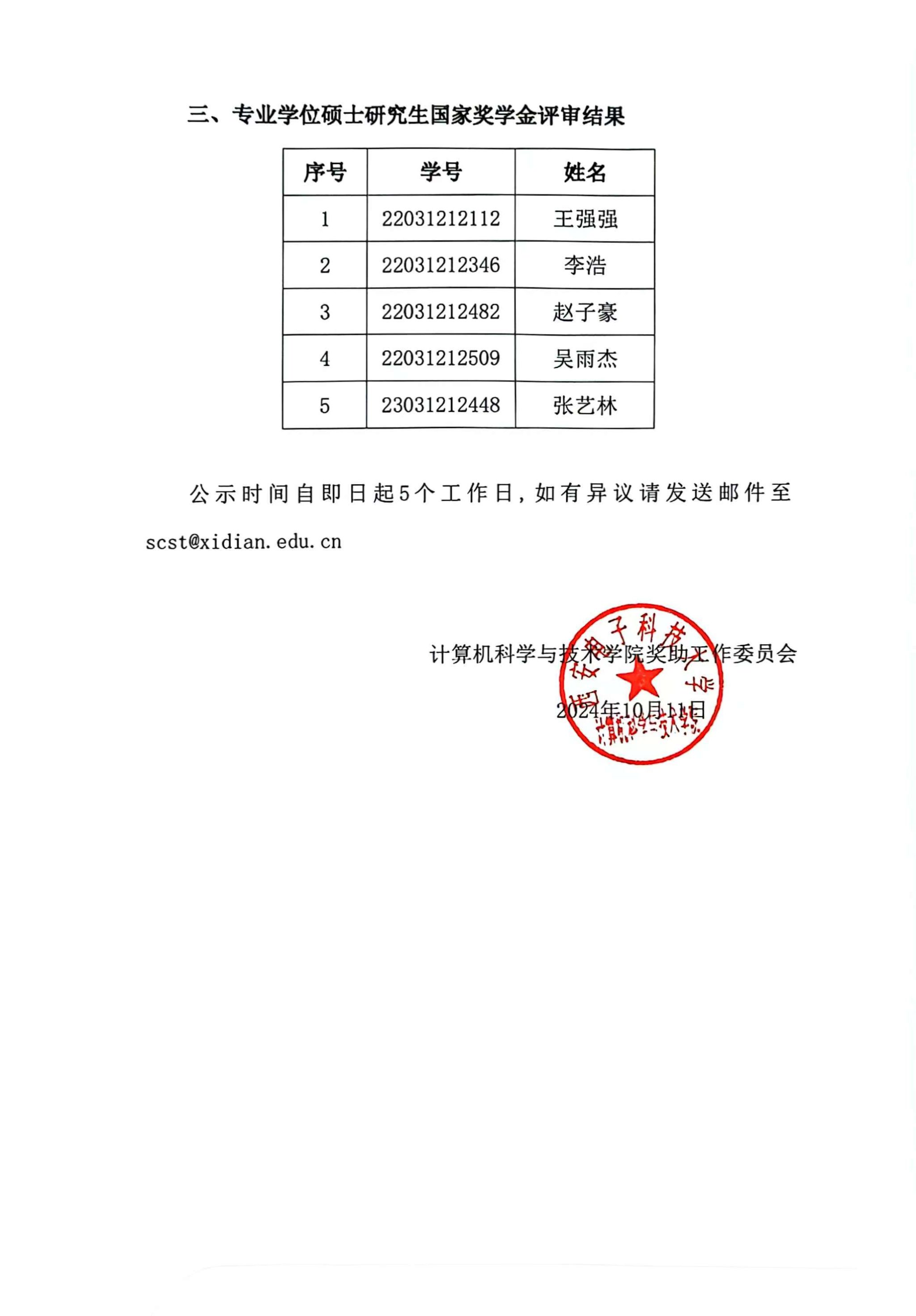 2024年研究生国家奖学金评审结果公示