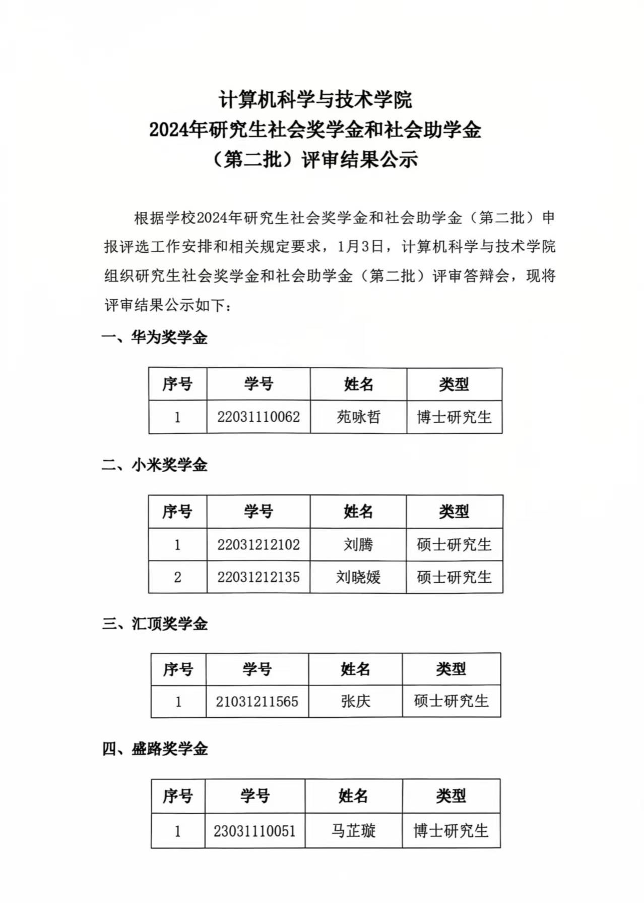 2024年研究生社会奖学金和社会助学金(第二批)评审结果公示