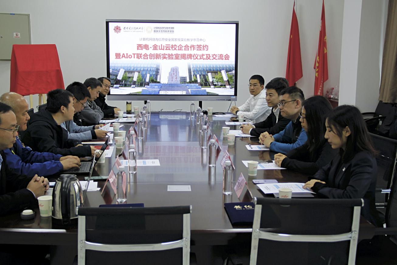 (通讯员 段毅 黄伯虎)11月19日上午,计算机网络与信息安全国家级实验教学示范中心与来访的北京金山云网络技术有限公司在新区E楼III-212会议室举行了“西电-金山云校企合作签约暨AIoT联合创新实验室揭牌仪式”系列活动。参会代表有金山云总经理殷帅、AI首席算法架构师苏驰、高级总监赵勇、高级技术经理丁明辉、项目经理刘不凡和高级商务经理陈晓萌等,公司及实验中心参会代表有信息资源中心主任张国良、公司本科教学负责人万波、国家级实验示范中心杨力、网络工程系主任权义宁,实验示范中心副主任贾文、王宗武和黄伯虎及骨干教师代表。