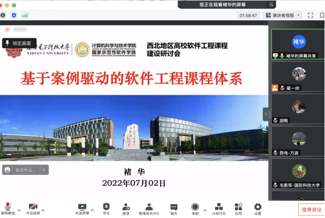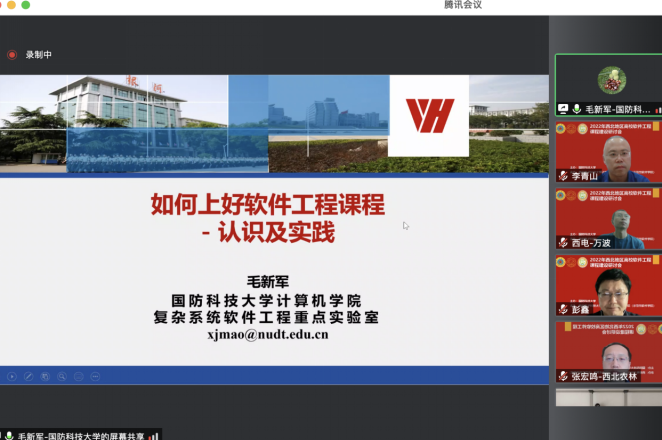 本次西北地区高校软件工程课程建设研讨会(以下简称研讨会),由国防科技大学主办,足球赌注网站(示范性软件公司)承办,研讨会邀请了国防科技大学、复旦大学、足球赌注网站、西安交通大学、西北工业大学、西北农林科技大学、陕西师范大学、西安科技大学、兰州大学、宁夏大学、青海师范大学、新疆大学、内蒙古大学等西北地区高校,通过特邀报告、交流沙龙等形式,交流软件工程课程教学和教改的成果,分享软件工程课程教学资源,商讨软件工程课程教学中遇到的各类困难和问题,提升软件工程课程建设水平。研讨会吸引了国内外软件工程相关领域教师的广泛参与。研讨会采用线上形式举行,腾讯会议室同时在线人数超过80人。