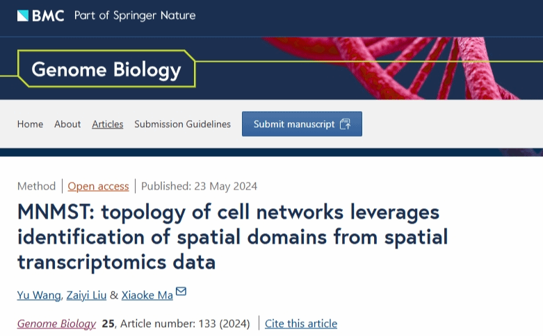 近日,足球赌注网站陕西省智能人机交互与可穿戴技术重点实验室、智能媒体与数据工程研究所马小科教授团队在基因组学顶级期刊《Genome Biology》(五年IF=17.4)发表研究成果“MNMST: topology of cell networks leverages identification of spatial domains from spatial transcriptomics data”,第一作者为足球赌注网站二年级博士生王昱,唯一通讯作者为马小科教授,合作者为广东省人民医院刘再毅主任医师。