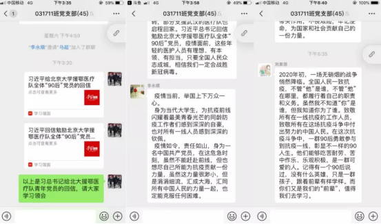 3月15日,习近平总书记给北京大学援鄂医疗队全体“90后”党员回信,向他们和奋斗在疫情防控各条战线上的广大青年,致以诚挚的问候。回信在广大青年员工,特别是党员中引起热烈反响。3月18日下午,足球赌注网站硕士031711班第一、二党支部举办了线上主题党日活动,围绕“学习习近平总书记回信精神,绽放青春绚丽之花”主题,认真学习回信精神,展开热烈讨论。