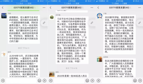 第一党支部支委成员朱耀耀感慨道:“自疫情开始,中华儿女以不同形式的爱心涌向湖北和武汉,全国医务工作者取消休假,坚守岗位,各地纷纷组织志愿者队赶赴武汉,不计个人得失,不惧生命威胁赶赴这场没有硝烟的战场,成为疫情道路上的‘最美逆行者’。作为一名年轻党员,我要向这些优秀党员学习,响应党和国家号召,以身作则。”他每天准时提醒班级同学填写“疫情通”,督导大家做好个人情况汇报工作。