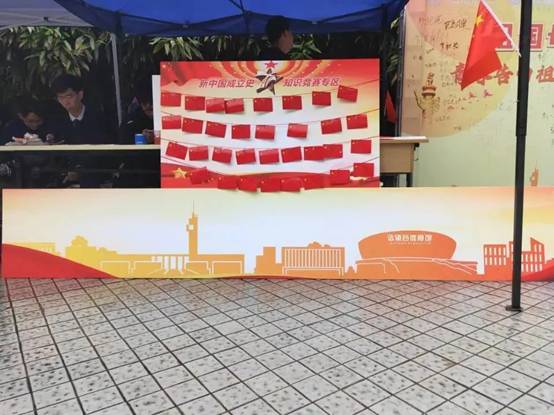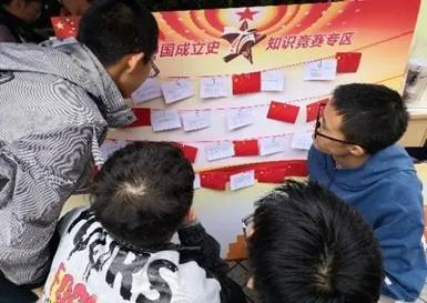 “社会主义制度在中国确立的标志?”“中国特色社会主义理论体系的内容?”“中国梦的基本内涵?”…新中国成立史知识竞赛专区,一面面小国旗的背后是同学们精心准备的新中国发展历史相关的问题,现场参与活动的同学们热情高涨,积极踊跃,在参与活动的过程中扩展了新中国史相关知识。