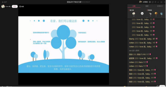 本科2017级辅导员张志为、研究生兼职辅导员黄彩红、辅导员助理王星予利用公司开发的“学在西电”线上教学app,直播了“晚点名”主题班会。因为首次尝试,尽管经过了数天的精心准备和测试,开始前他们还是非常忐忑。从晚8点开始,他们所负责的2017级计算机科学技术专业和物联网专业的500余名本科生分三拨召开了线上班会。看到直播顺畅,同学们基本都到齐了,在平台上跟导员老师活跃地互动,还有部分家长以访客身份观看直播,他们才放下心来,直呼“心血没有白费”。