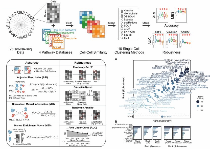 该论文设计了一套系统性的集成和评估框架sciPath,包含集成生物通路信息的方法,和一系列评价单细胞聚类准确性和鲁棒性的指标。该框架比较了现有单细胞聚类方法在集成生物通路信息前后的性能,发现生物通路信息可以提供更有效且稳定的细胞类型信号。同时,研究者对生物通路信息的冗余对提升聚类效果的影响进行讨论。