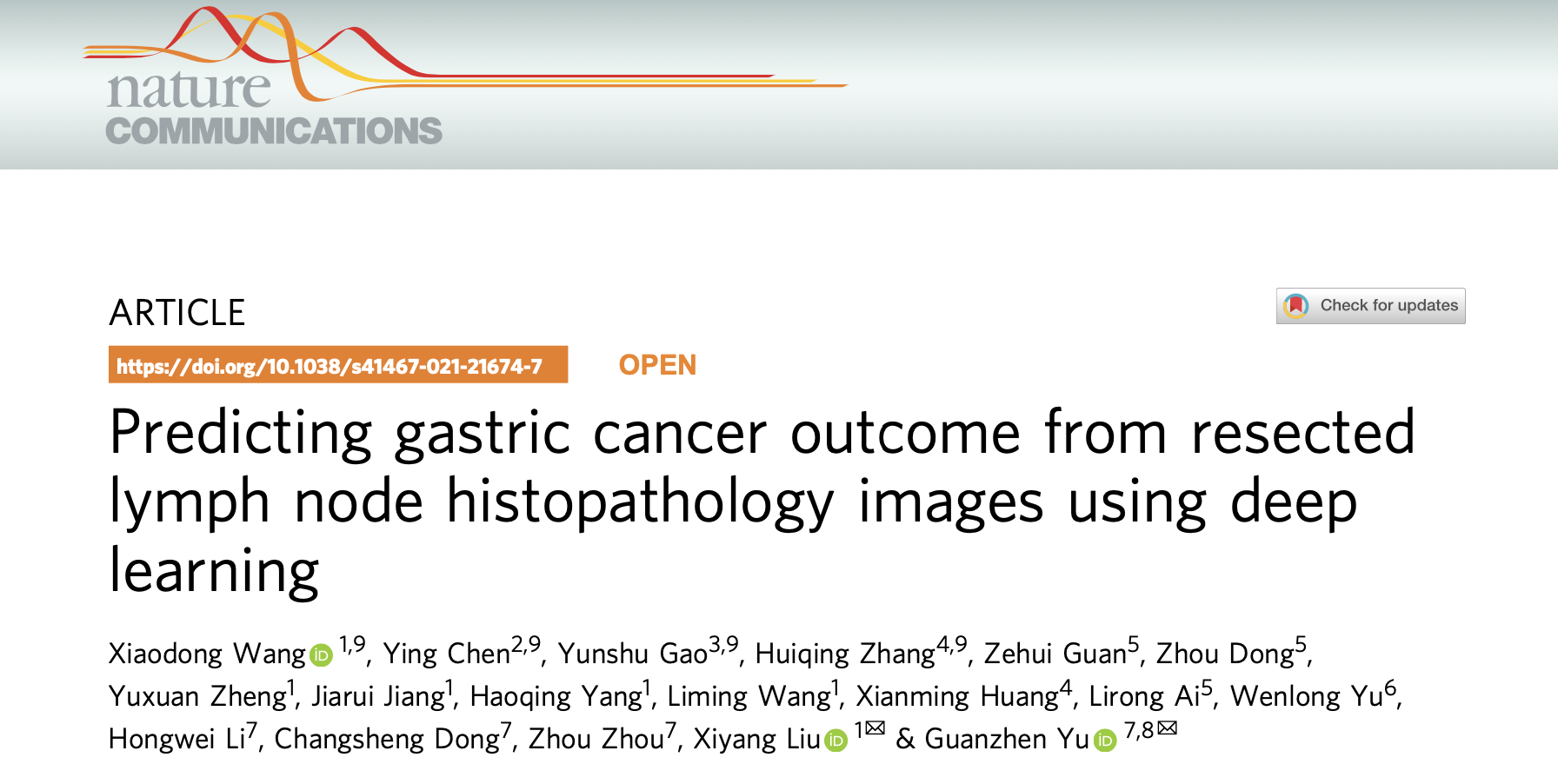 (通讯员 王晓东)足球赌注网站软件工程研究所刘西洋教授团队,在公司“软件工程”团队建设支持下,与上海龙华医院于观贞教授、长海医院陈颖教授等团队合作,开展了胃癌淋巴结转移预后预测的AI研究,历时三年,近期以西电第一作者单位在Nature Communications (IF=12.1)发表成果“Predicting gastric cancer outcome from resected lymph node histopathology images using deep learning”,研发了针对胃癌淋巴结病理临床诊断与精准亚分期的AI系统。
