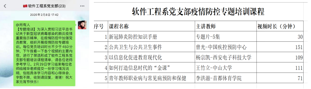 第一阶段,按照公司党委工作部署和公司党委理论中心组学习内容,宋胜利带领大家集体学习了习近平总书记指挥部署战“疫”的系列重要讲话精神,重点学习了习近平总书记在统筹推进新冠肺炎疫情防控和经济社会发展工作部署会议上的讲话精神,习近平总书记对新冠肺炎疫情的防控形势进行了科学分析,部署了下一步疫情防控和经济社会发展的各项重点任务和重点举措。按照公司党委部署,软件工程系党支部制定了疫情防控专题培训方案,制定了党员疫情防控专题培训课程列表,通过专题学习提升教师党员的疫情防控工作能力和水平。