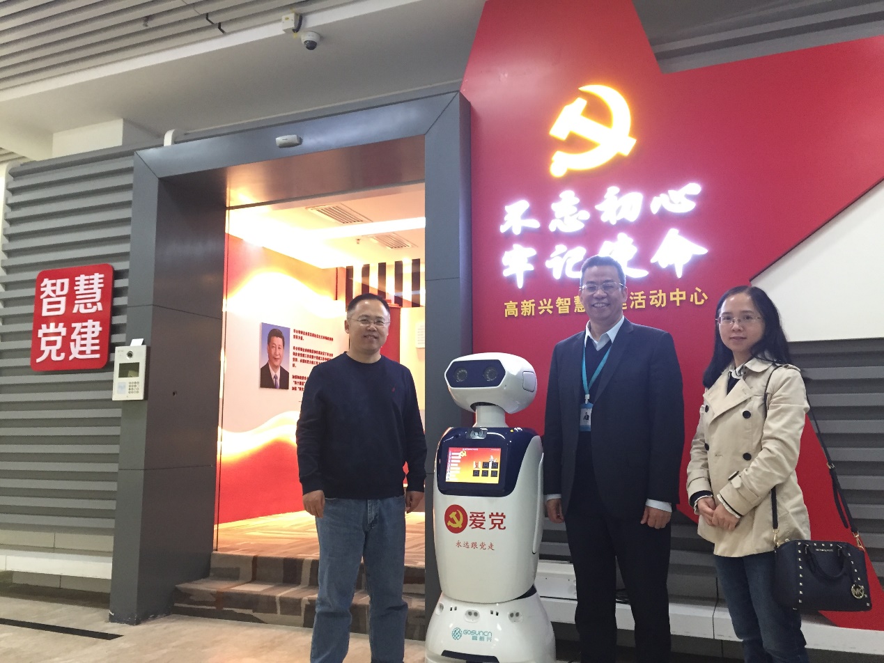调研组一行特别与公司在高新兴集团实习的研究生深入交流,关心研究生在企业的工作生活情况,就研究生联合培养相关问题进行交流,充分听取意见建议。重点参观了高新兴集团智慧党建活动中心,就院企党建工作进行现场讨论,该企业党建活动中心的架构设计为公司党建工作阵地建设提供了思路。