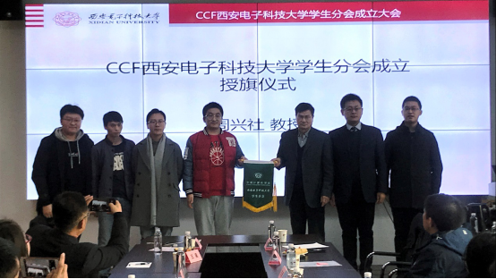 随后,周兴社教授为CCF西电员工分会指导委员会督导主任苗启广教授、分会首届主席及执委会成员颁发聘书,并进行了授旗仪式。当选主席李超能带领执委成员接旗宣誓,并做主题发言,发言中当任主席对未来一年的工作计划做了充分设想,并表达了依托CCF平台和资源建设具有西电特色的员工分会的决心和信心。员工会员辛文天代表CCF广老员工会员表达了同学们的心声以及响应CCF学术活动的积极心态。