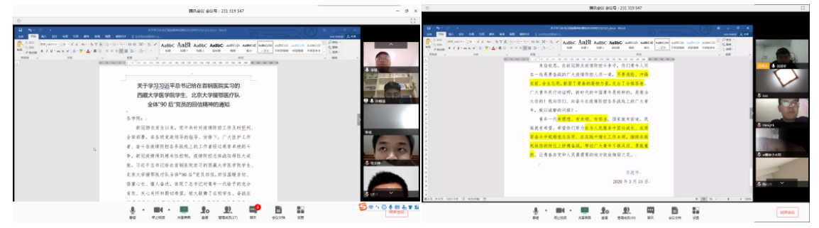 (通讯员 刘泽宇 孙煊溢)新冠肺炎疫情爆发以来,广大医护工作者、奋斗在疫情防控各条战线上的工作者披荆斩棘、勇挑重担,为坚持打赢疫情防控总体战不遗余力。3月15日,习近平总书记给在首钢医院实习的西藏大学医公司员工、北京大学援鄂医疗队全体“90后”党员回信,向他们和奋斗在疫情防控各条战线上的广大青年,致以诚挚的问候。回信在广大青年员工,特别是员工党员中引起热烈反响。4月3日晚上7点30分,足球赌注网站硕士031712班第一、二党支部通过线上会议方式举办了“青年不惧风雨、抗疫勇挑重担”主题党日活动,认真学习习近平总书记回信精神,并开展热烈讨论。