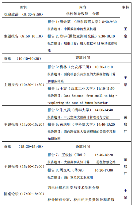 本次研讨会围绕大数据共性关键技术,如大数据生态与系统、大规模并行数据库、流式计算与内存计算模式、大数据分析调度与优化、大数据知识图谱、大数据智能挖掘处理算法、大数据可视化、大数据安全与隐私保护、大数据分布式计算与深度学习、智能视觉大数据、生物大数据挖掘等核心内容,邀请国内外高等院校、研究院所和知名互联网企业等大数据领域知名专家与学者到会,通过主题报告、圆桌论坛(Panel)和交流沙龙等形式,组织校内外师生共同进行深入探讨和交流,分享大数据分析领域的理论研究和核心技术新进展,促进公司大数据相关学科领域更好地建设和发展,扩大公司“计算机科学与技术”一流学科的知名度和影响力。