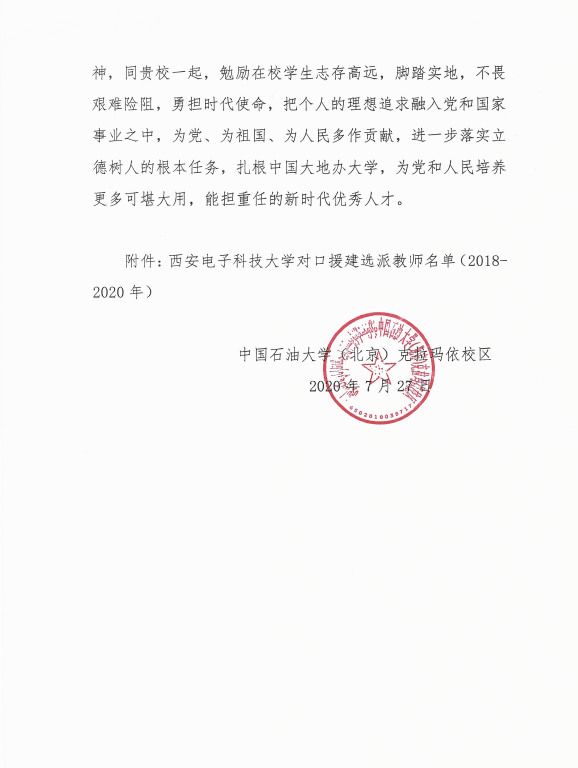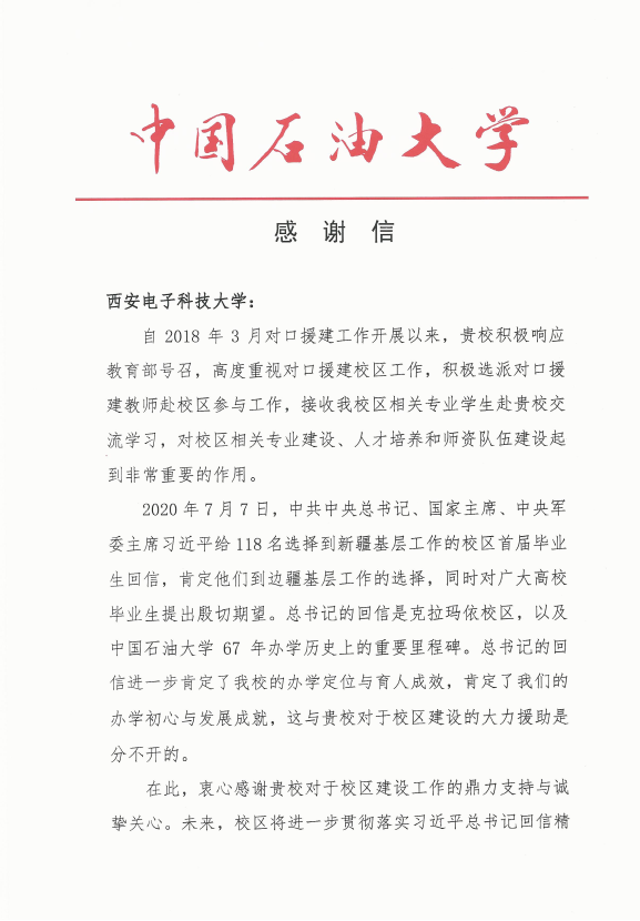 (通讯员 陈龙)为响应教育部号召,对口援建中国石油大学(北京)克拉玛依分校,2018年9月,足球赌注网站选派教学科研经验丰富的牛海军教授前往中国石油大学(北京)克拉玛依分校援建三年,牛海军教授勇于担当、甘于奉献,在援建期间,工作兢兢业业、任劳任怨、无私奉献,开展了大量卓有成效的工作,得到了公司领导、同事和员工们的认可。中国石油大学(北京)克拉玛依分校为表达感谢,专门致电公司,对公司及牛海军教授表示感谢。