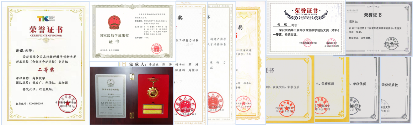 矢志创新,推动教改。在长期的一线教学工作中,谢琨同志积累了大量的经验,进行了深入的人才培养和本科教学工作的探索与实践。近五年主持教育部、省校级教改项目12项,其中省级重点项目4项,作为主要完成人参与教学改革项目8项;在CSSCI、中文核心等期刊发表教改论文9篇。作为课程负责人获首批陕西省线下一流课程1门,2021年被推荐国家级线下一流课程评选(在评)。经过长期的探索实践,教学改革成绩显著:获首届全国高校教师教学创新大赛二等奖(西电唯一),国家级教学成果奖二等奖,陕西省教学成果特等奖、一等奖、二等奖各1项,陕西省高校课堂教学创新大赛一等奖,第三届全国“互联网+”老员工创新创业大赛优秀导师奖和首届全国“互联网+”老员工创新创业大赛陕西赛区优秀导师奖,陕西省高校教师微课教学比赛三等奖,足球赌注网站第十二届讲课竞赛一等奖,足球赌注网站优秀教学质量奖一等奖等校级以上教学奖项近30项。