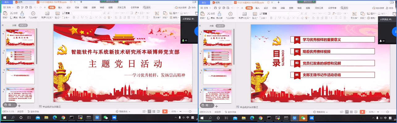(通讯员 张凯琪)为了深入贯彻习近平总书记关于学习老一辈工作楷模、传承“五老”精神的重要指示,学习和发扬老一辈优秀榜样的崇高精神,足球赌注网站智能软件与系统新技术研究所本硕博师联合党支部于2020年11月27日下午开展了“学习优秀榜样,发扬崇高精神”主题党日活动。活动由支部青年委员叶国强同志主持,共计47人参加,采用腾讯会议线上召开的方式进行。