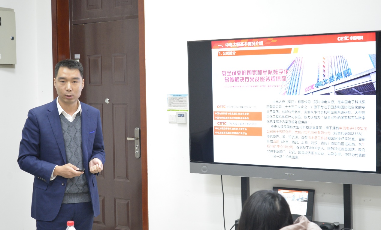 宋锋书记介绍了中电太极(集团)有限公司的基本情况,着重分享了西安研发中心党支部组织建设、思想引领和党建宣传、群团工作开展情况。他介绍到,中电太极是十大军工央企之一中国电子科技集团有限公司的子集团,作为国家和军队数字化总体解决方案及服务提供商,为国防和国民经济信息化建设作出了重要贡献。他结合人才成长平台分享了中电太极集团“事业留人”的军工文化。