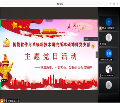 (通讯员 张恒运)为庆祝中国共产党建党100周年,深入学习贯彻习近平总书记在党史学习教育动员大会上的重要指示精神,从党的非凡历程和实践中汲取初心使命的力量,足球赌注网站智能软件与系统新技术研究所本硕博师联合党支部于2021年5月28日下午开展了“重温党史,不忘初心,发扬古田会议精神”主题党日活动。活动由支部副书记吕文琪同志主持,共计56人参加,会议以线上和线下的方式进行展开。