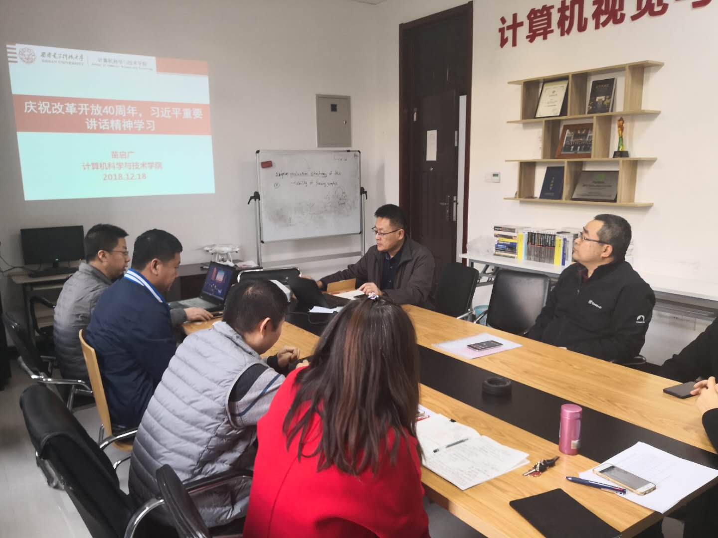 (通讯员 王琨)12月18日上午,庆祝改革开放40周年大会隆重召开。中共中央总书记、国家主席、中央军委主席习近平出席大会并发表重要讲话。当天下午,足球赌注网站网络工程系党支部在主楼四区225开展了学习“习近平在庆祝改革开放40周年大会上的重要讲话”主题党日活动。本次活动由支部书记苗启广教授主持,支部党员参加学习。