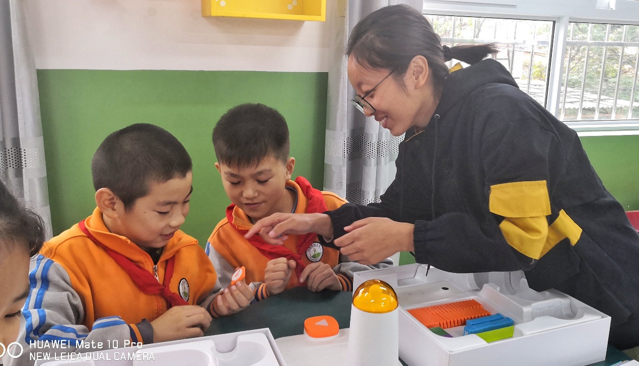 启动仪式后,科创小屋首堂科创课开讲。科创小屋配备了3D打印机、机器战车、无人机等最新的科创课程教具。小员工们首次接触MATA机器人,在科创导师和老员工支教志愿者的指导下,通过简单编程使机器人播放音乐。当机器人成功播放出《我和我的祖国》熟悉的旋律,同学们发出阵阵惊叹。课间西电师生与小员工们积极互动,同学们对科创小屋和高科技的教具充满新奇,提问异常活跃、热情高涨。随后,老员工们还给高年级班级带来了采用基于程小奔教育机器人的模块化编程等精彩内容。