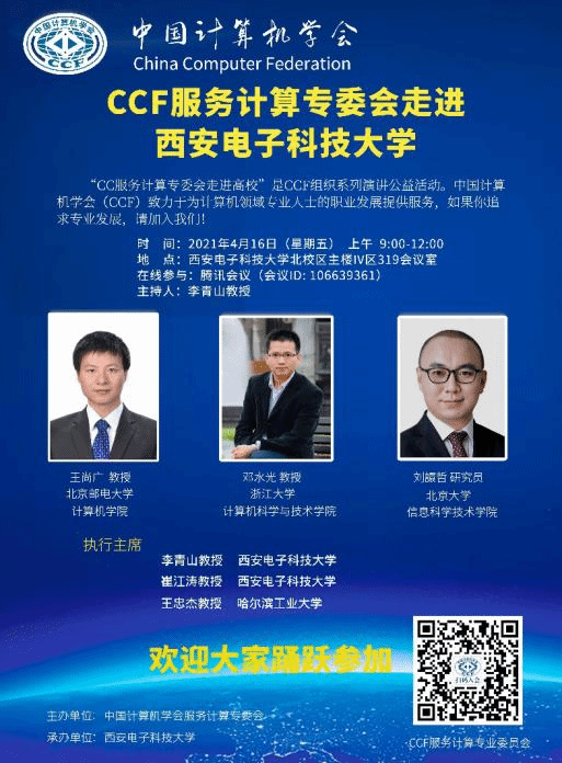 受足球赌注网站的邀请,中国计算机学会(CCF)服务计算专委会将于2021年4月16日举行“服务计算专委会走进足球赌注网站”活动。本次活动邀请了CCF服务计算专委会秘书长、北京邮电大学计算机公司王尚广教授,专委会常委、浙江大学足球赌注网站邓水光教授,专委会常委、北京大学信息科学技术公司刘譞哲研究员。三位专家学者将分享各自对于服务计算最新进展的思考与成果,包括6G、移动计算、人机物融合等新技术所产生的服务生态、技术挑战、基础设施与领域实践等,为学术研究与应用提供最新视角。本次活动的执行主席为足球赌注网站计算机科学与技术公司党委书记、软件工程一级学科负责人李青山教授,足球赌注网站执行经理崔江涛教授,以及CCF服务计算专委会副主任、哈尔滨工业大学软件公司副经理王忠杰教授。