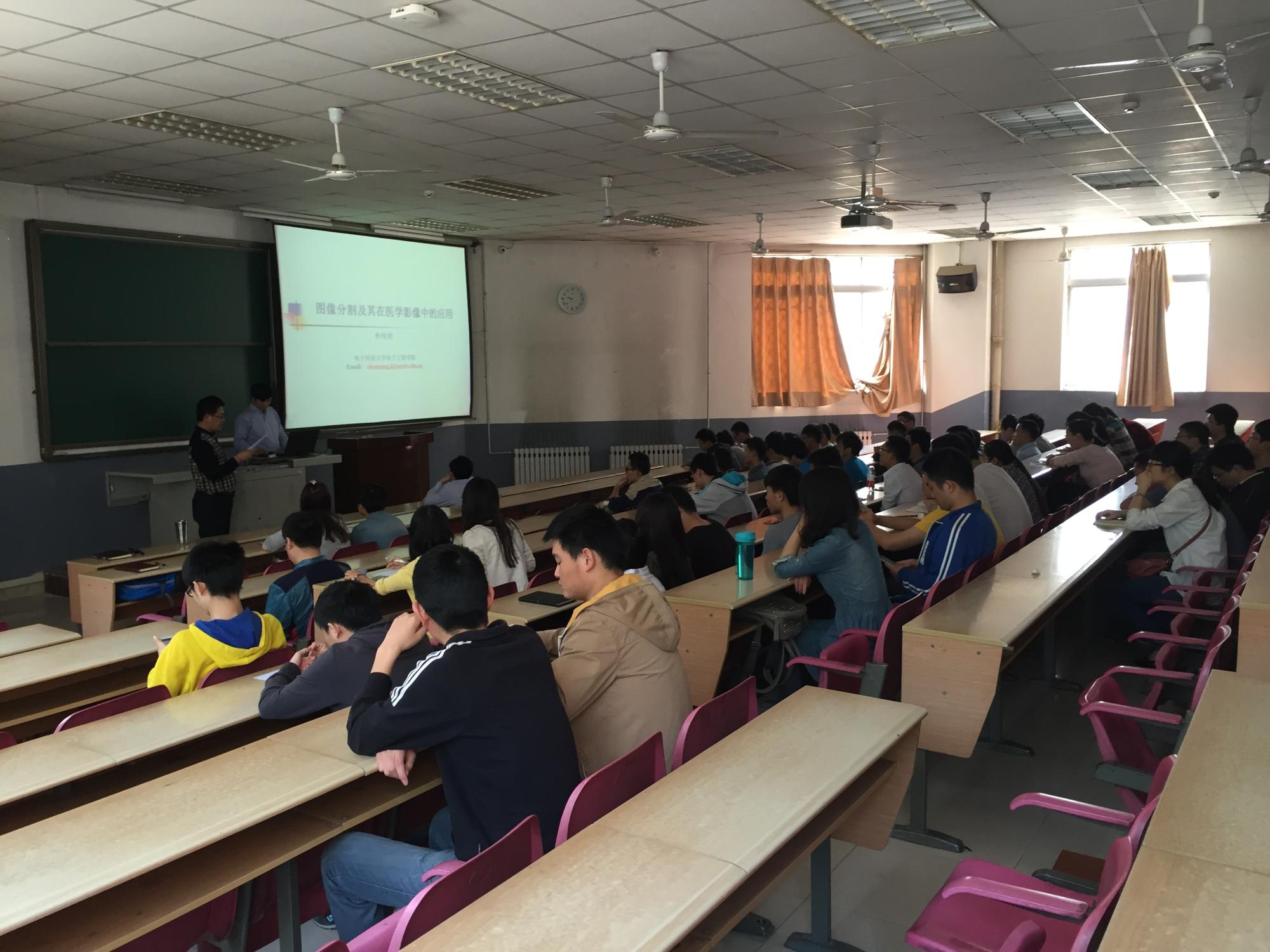 李教授与参加报告会的老师和同学们展开了热烈的讨论。关于水平集符号函数的设计,水平集的迭代速度与收敛条件,以及水平集在遥感图像、自然图像中的应用等问题,解决了大家的疑问。