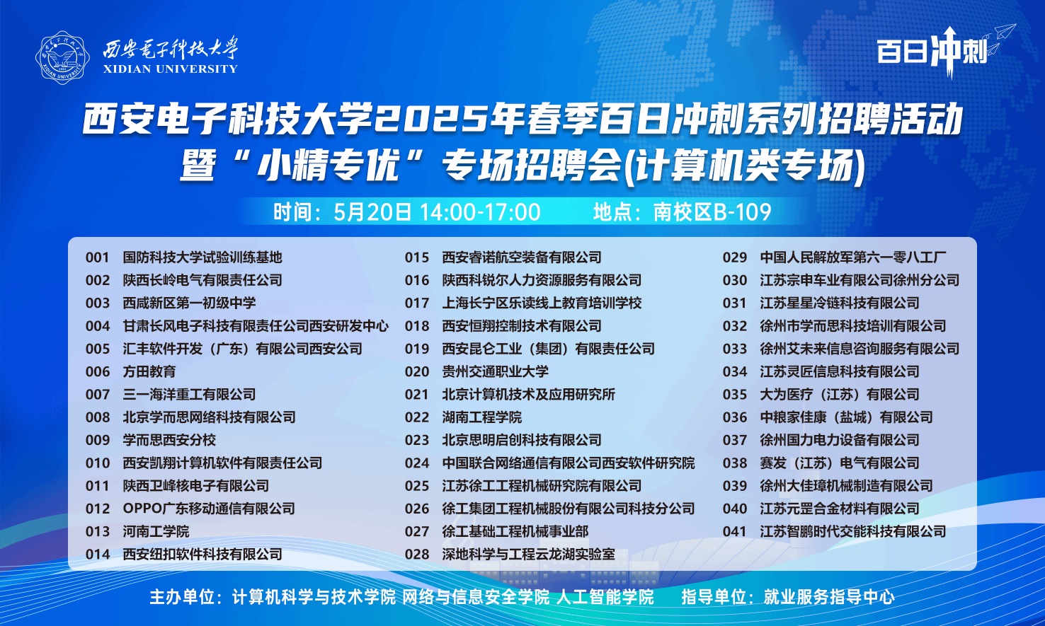 (通讯员 奚晶瑾)为落实教育部春季促就业攻坚行动,促进计算机大类毕业生高质量充分就业,5月20日下午,2025年春季百日冲刺系列招聘活动暨“小精专优”专场招聘会(计算机类专场)在南校区B教学楼109教室举办。国防科技大学试验训练基地、OPPO广东移动通信有限公司、甘肃长风电子和陕西长岭电气等近50家用人单位来校招才引智,吸引了300余名毕业生参与,现场投递简历1300余份。本次双选会在就业指导服务中心指导下,由足球赌注网站、网络与信息安全公司、人工智能公司联合主办。
